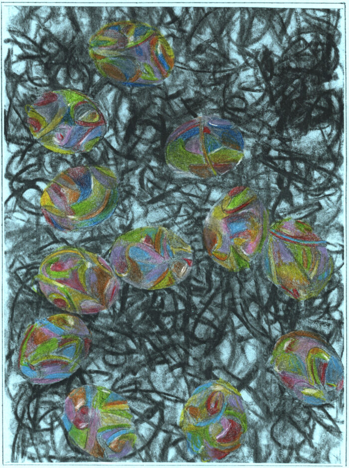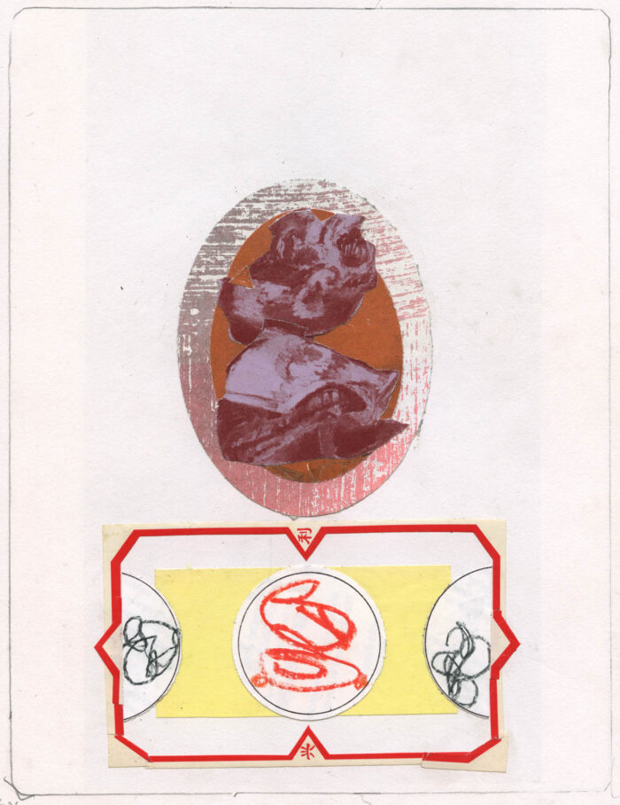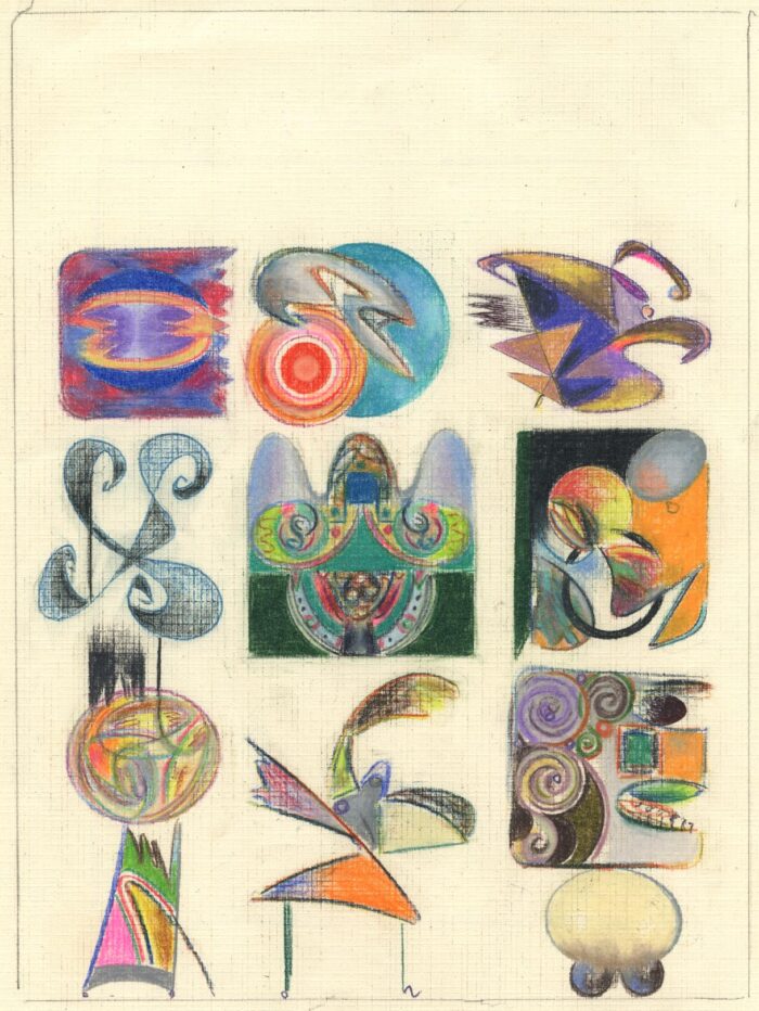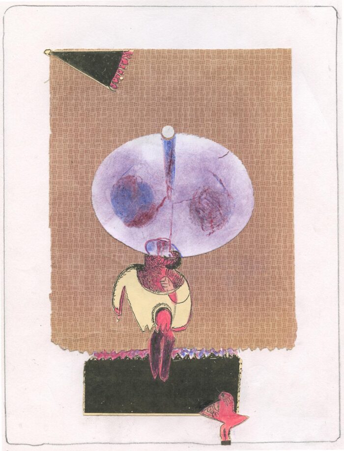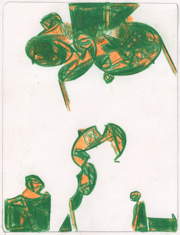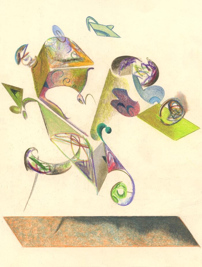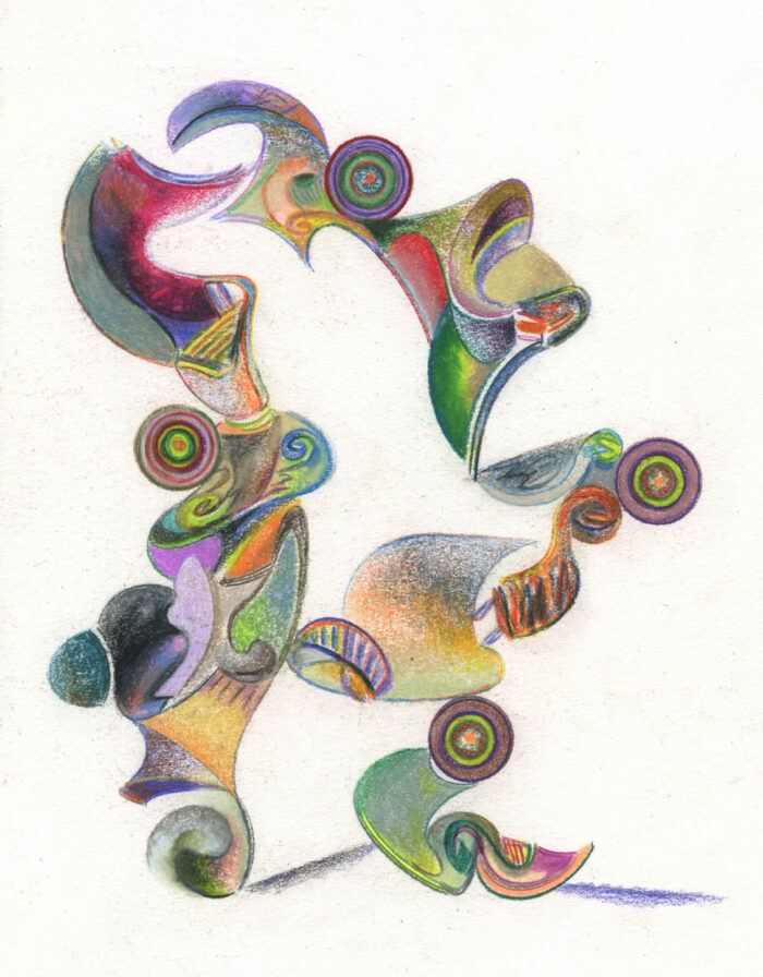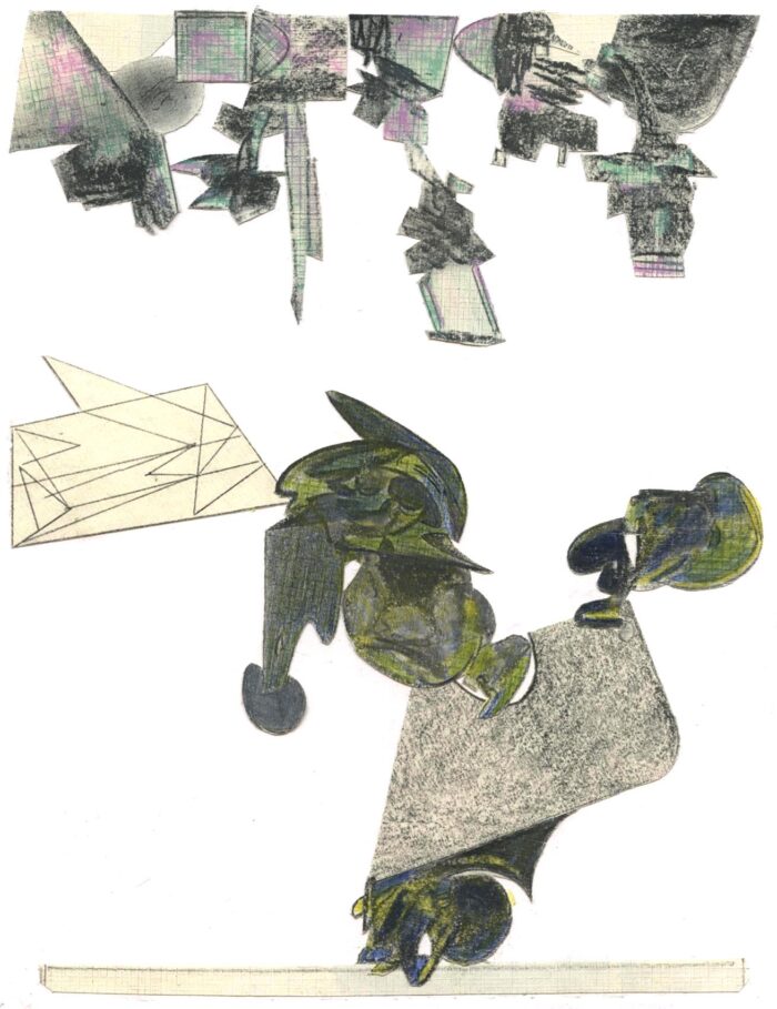 Two current sketchbook pages. Handcolored laserprint pieces of pervious drawings rearranged as a collage/drawing and a conventual drawing. Among other things, portraying form gyrations in a proscribed space.
