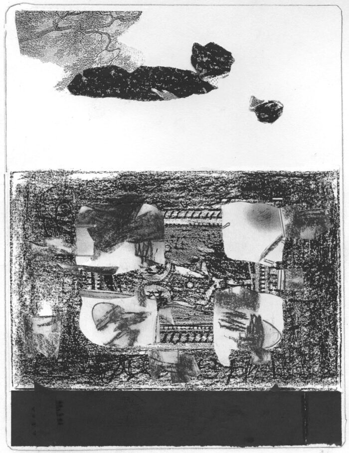All in a days work: a collage (from a discarded 2006 flyer) a drawing/collage (from previous laser prints of the same overall drawing) and, finally, from my car on the way out of the CalArts campus where I have my studio)...
