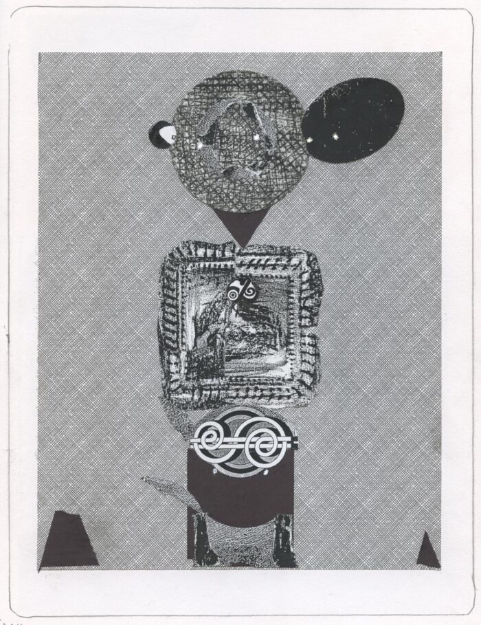 A discombobulated walker, and the combobulated place the walker is walking in: two collage/drawings from current sketchbook, #182, pages 58 and 59, 2026.