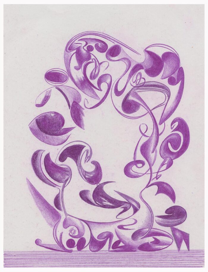 Two current sketchbook pages. Handcolored laserprint pieces of pervious drawings rearranged as a collage/drawing and a conventual drawing. Among other things, portraying form gyrations in a proscribed space.